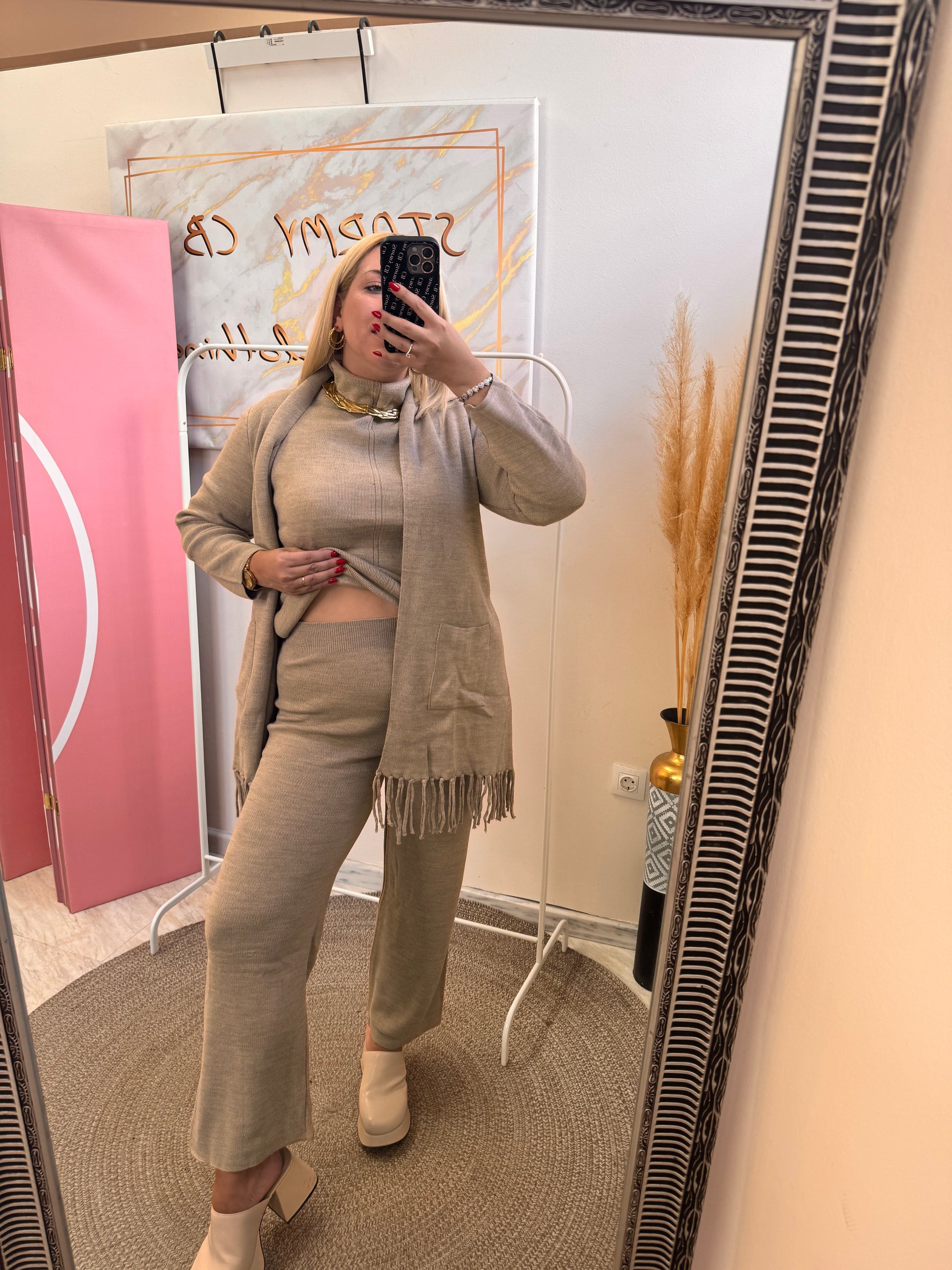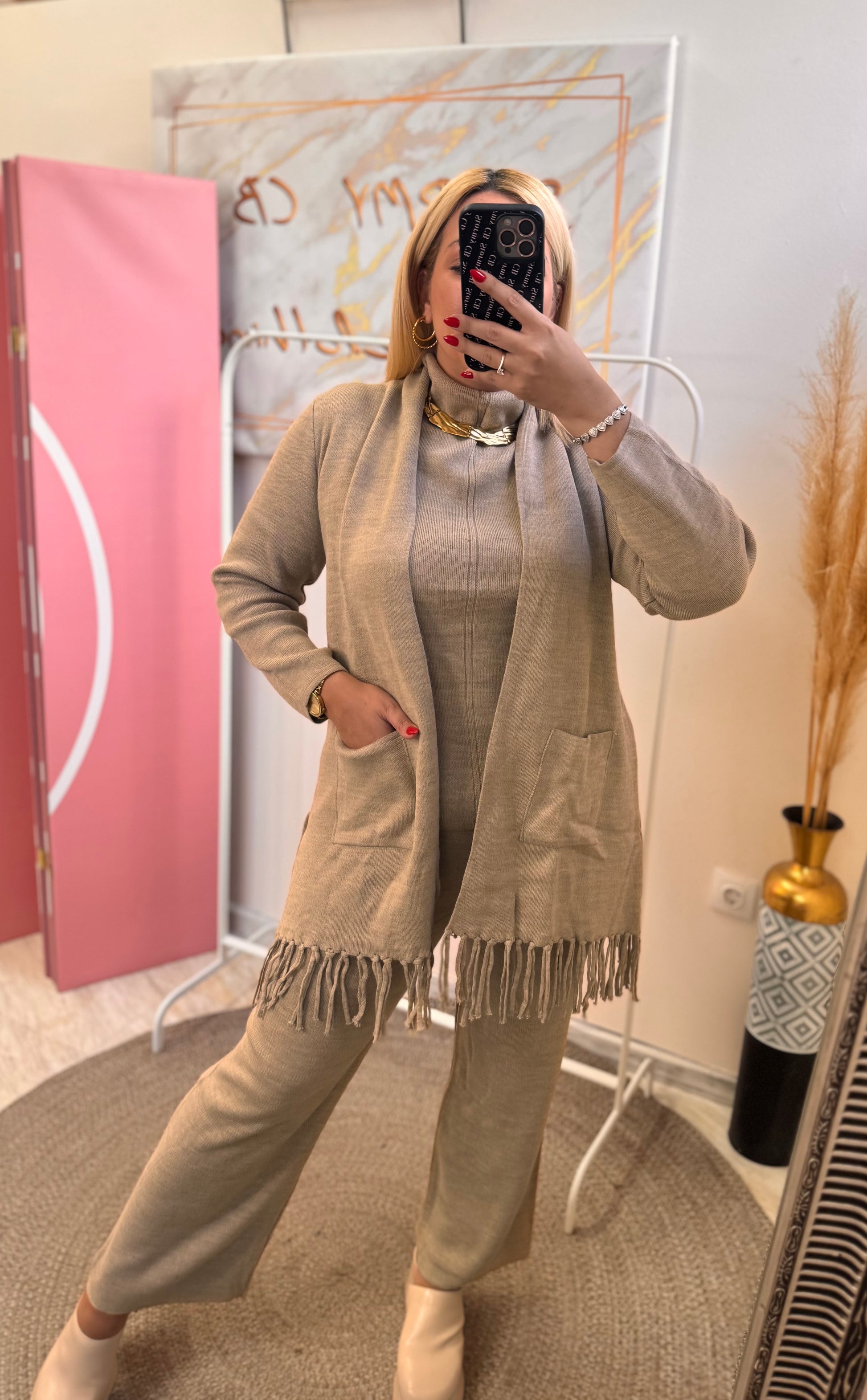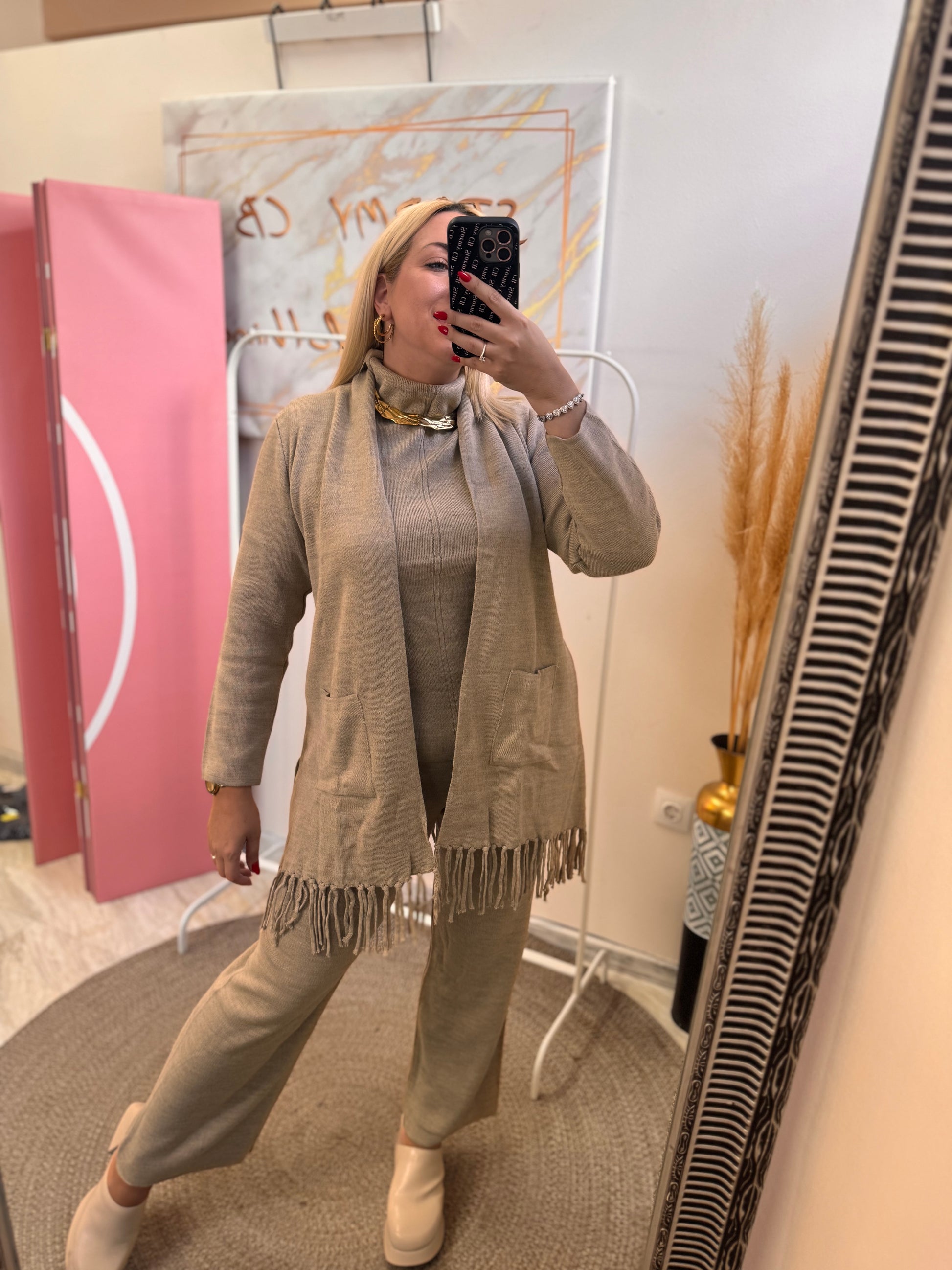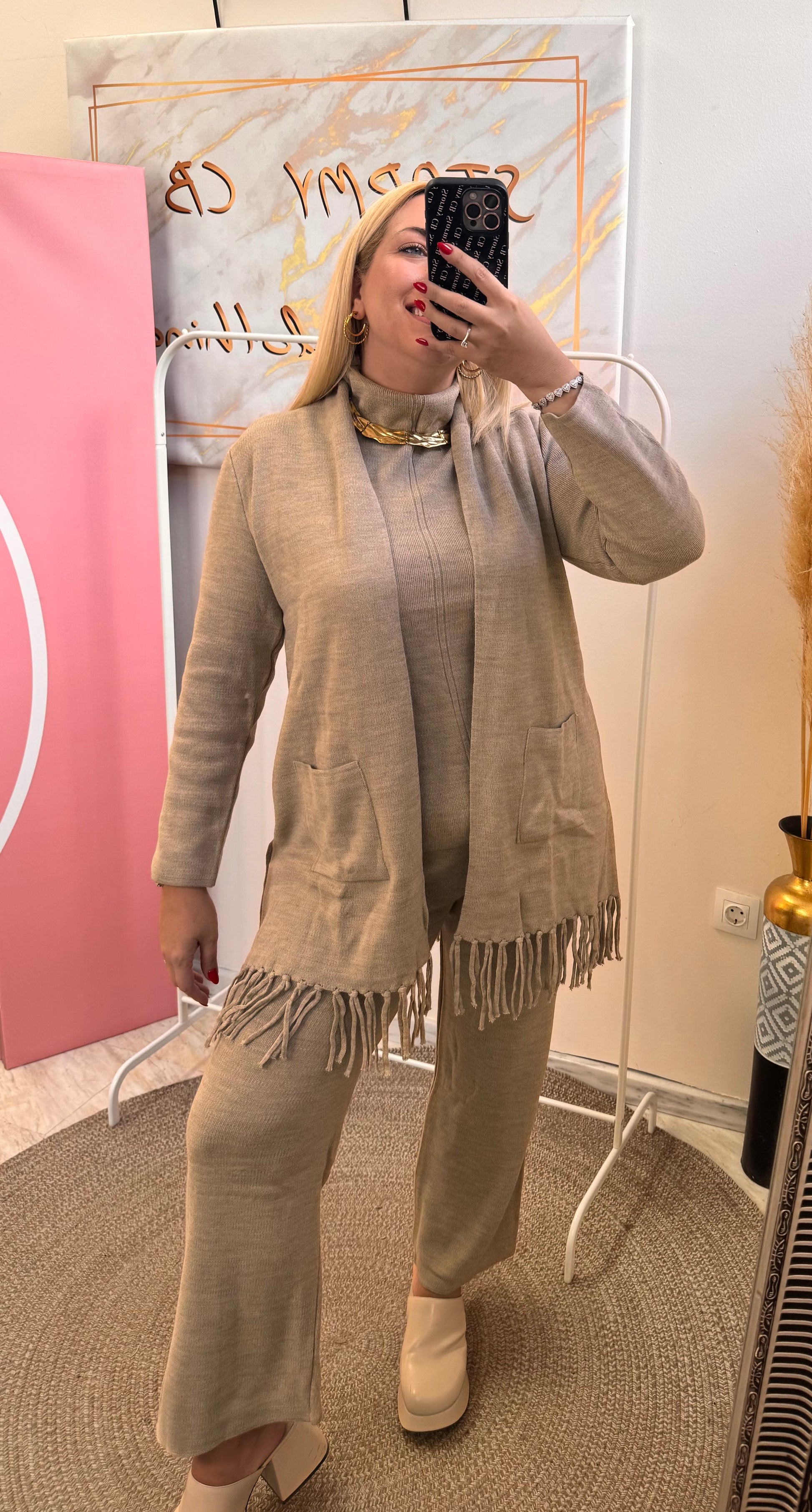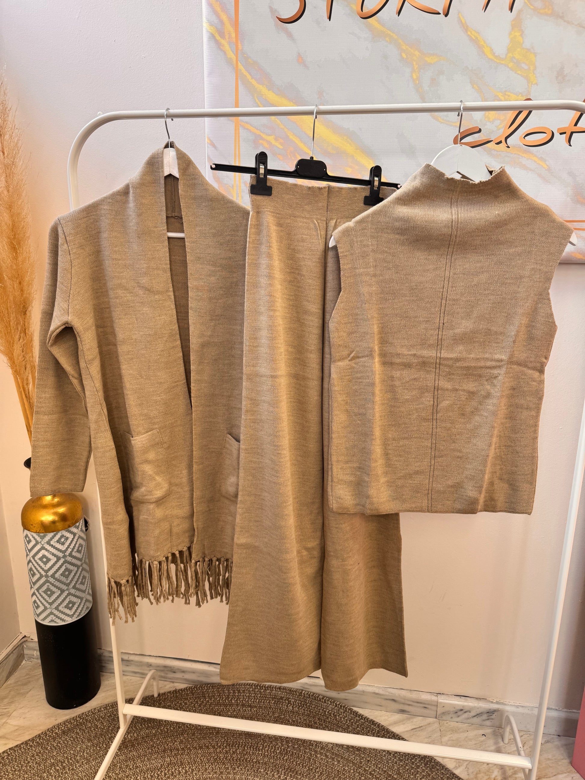 -Διαθέτει τρια κομμάτια, ζακέτα με κρόσια, αμάνικο μπλουζάκι ζιβάγκο και παντελόνι