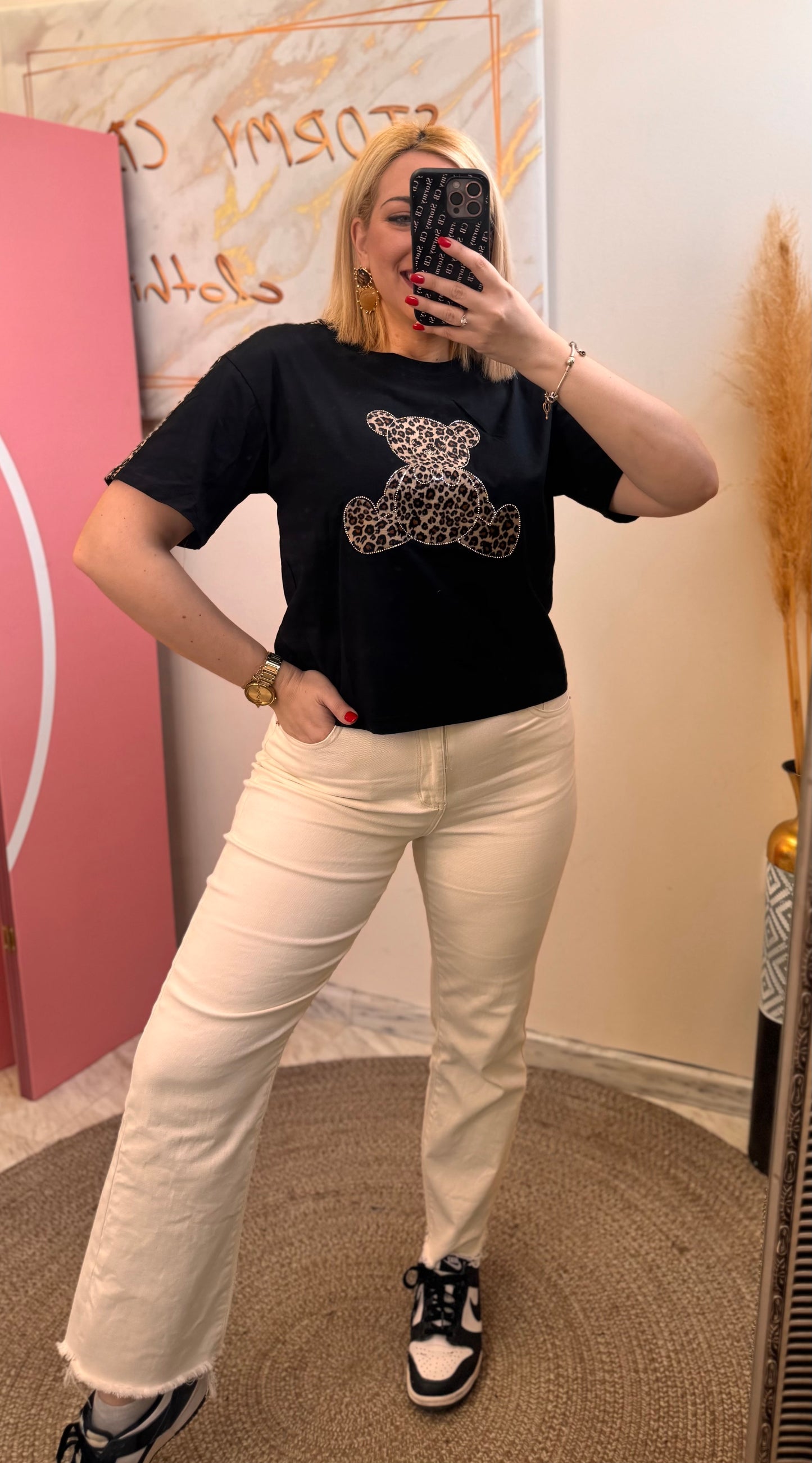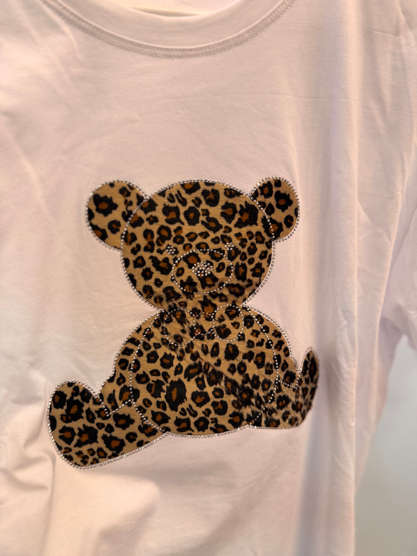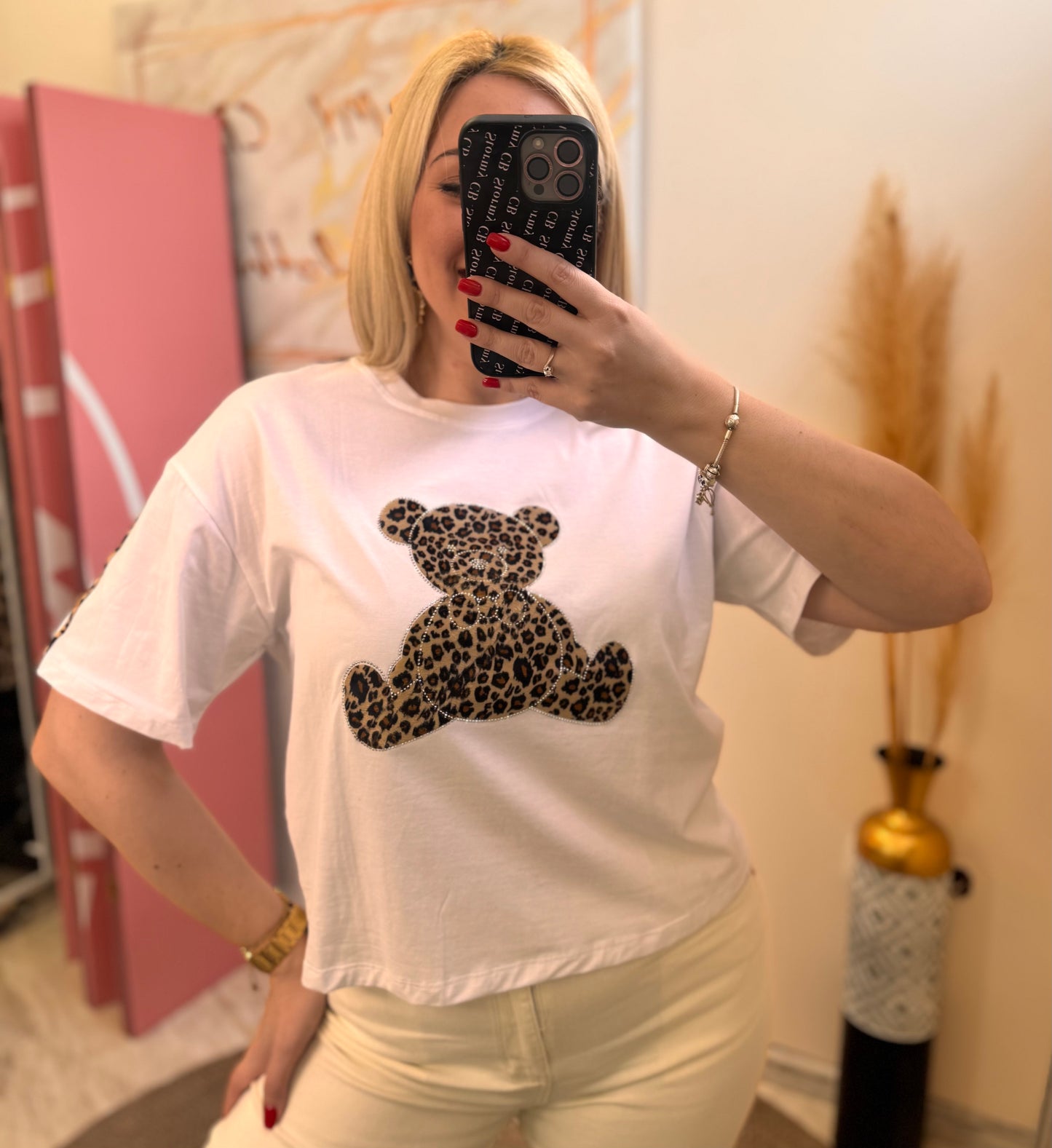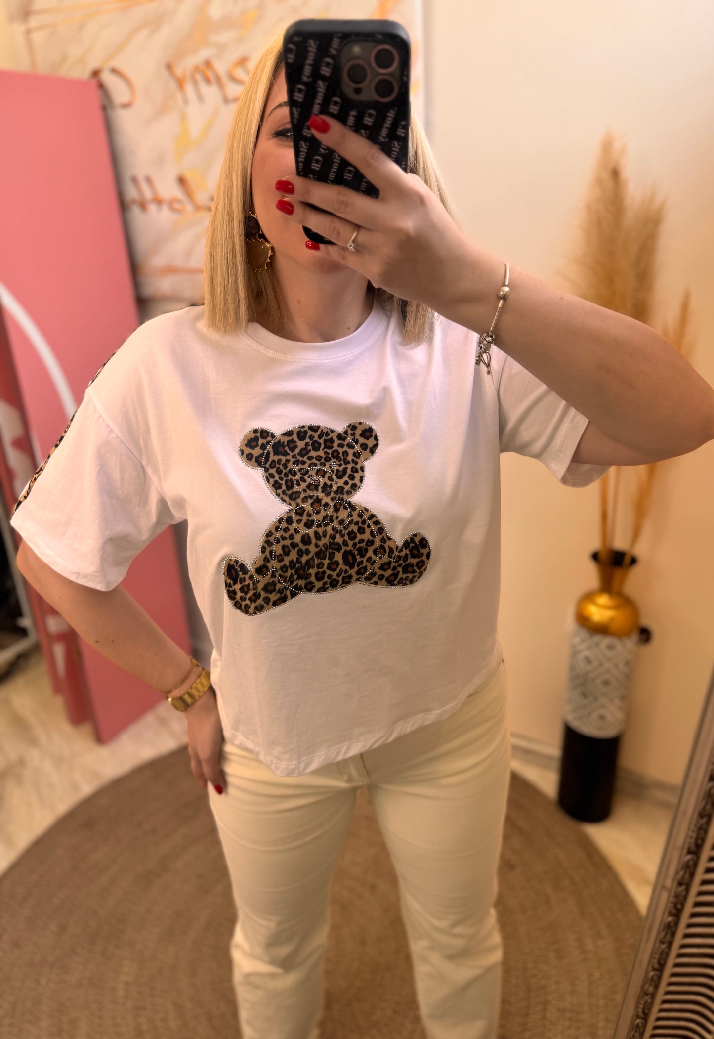 •Leopard αρκουδακι από ύφασμα με λεπτομέρειες στρας και διπλή ρίγα λεοπάρ στον ωμίτη.