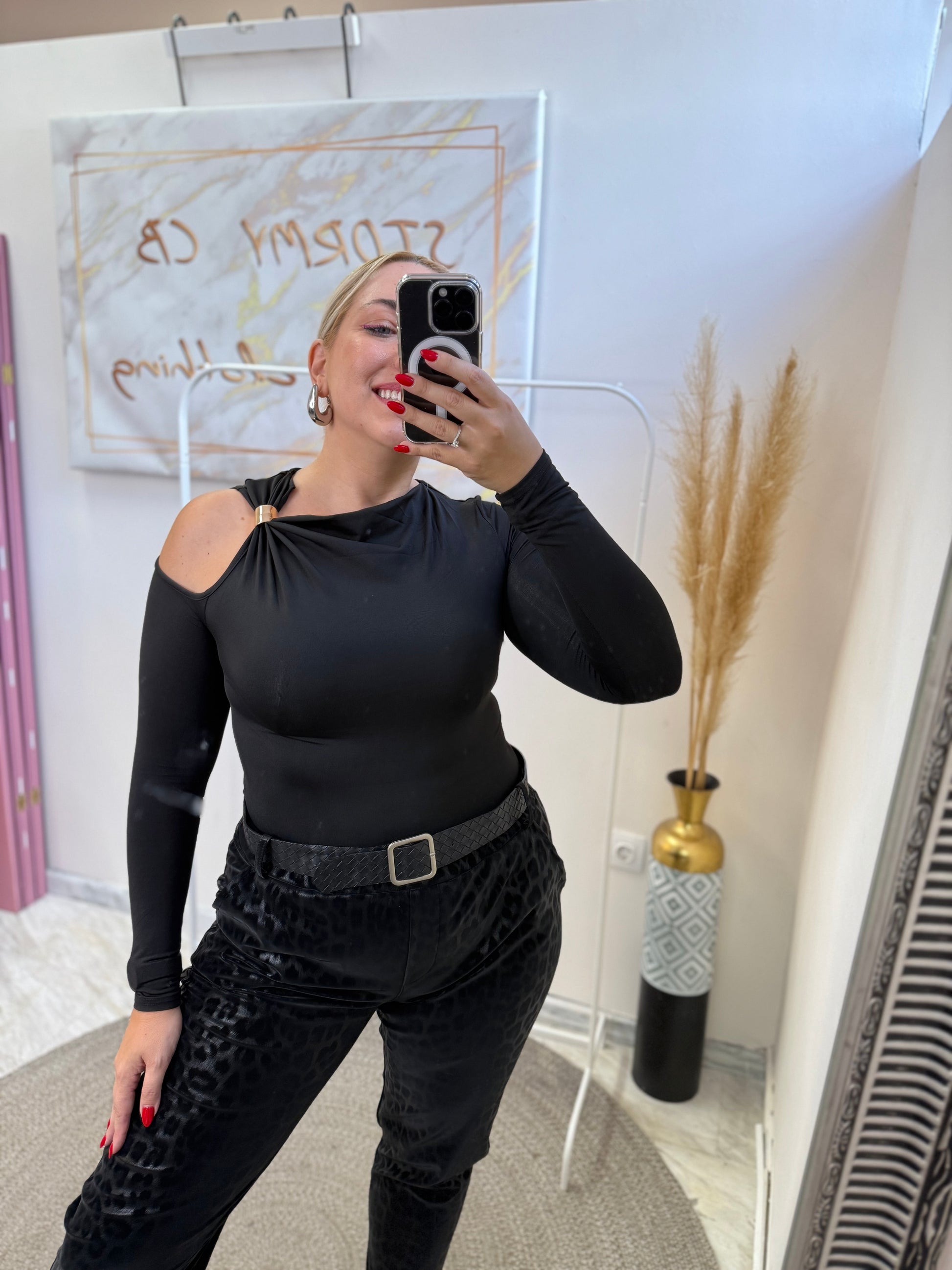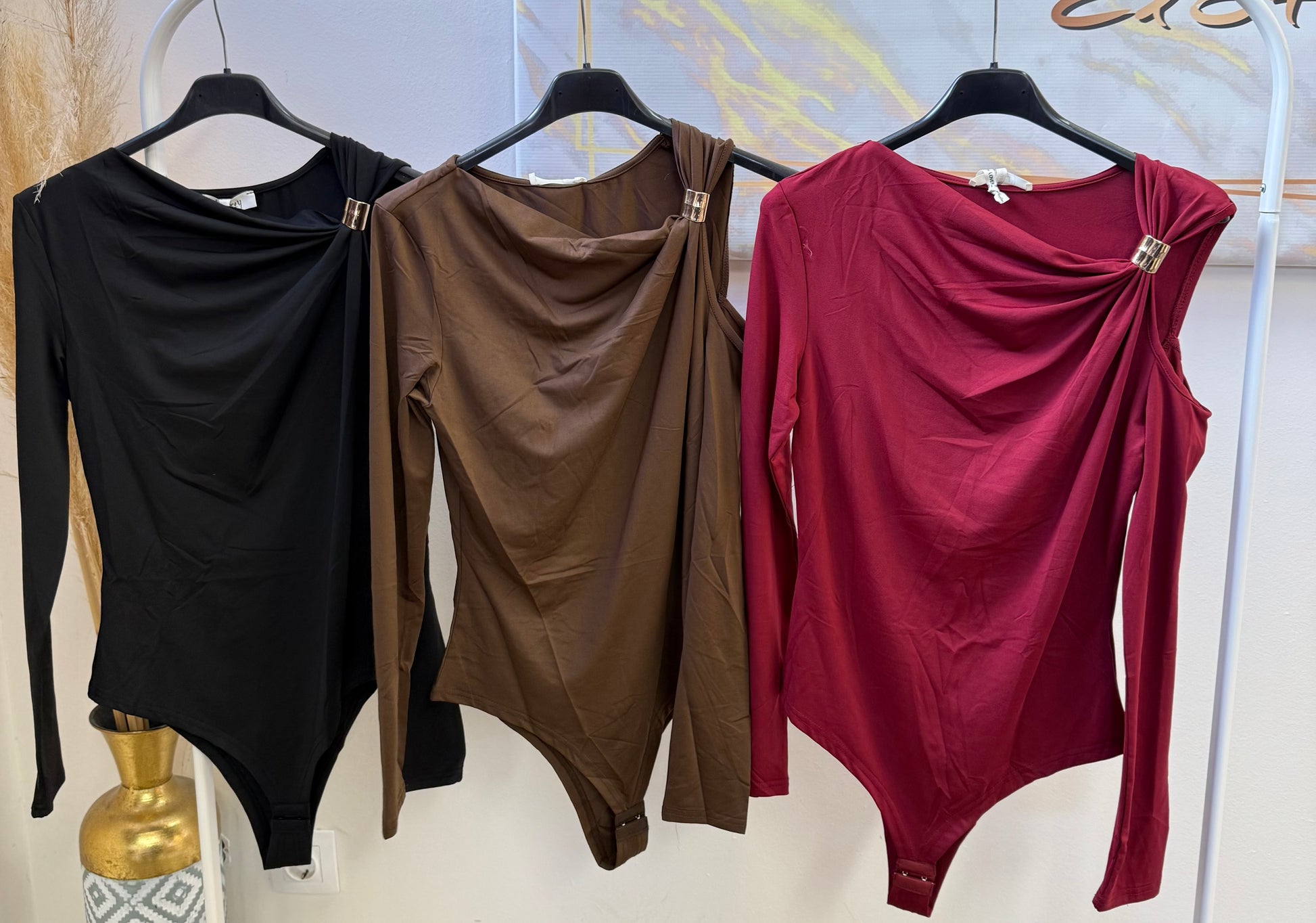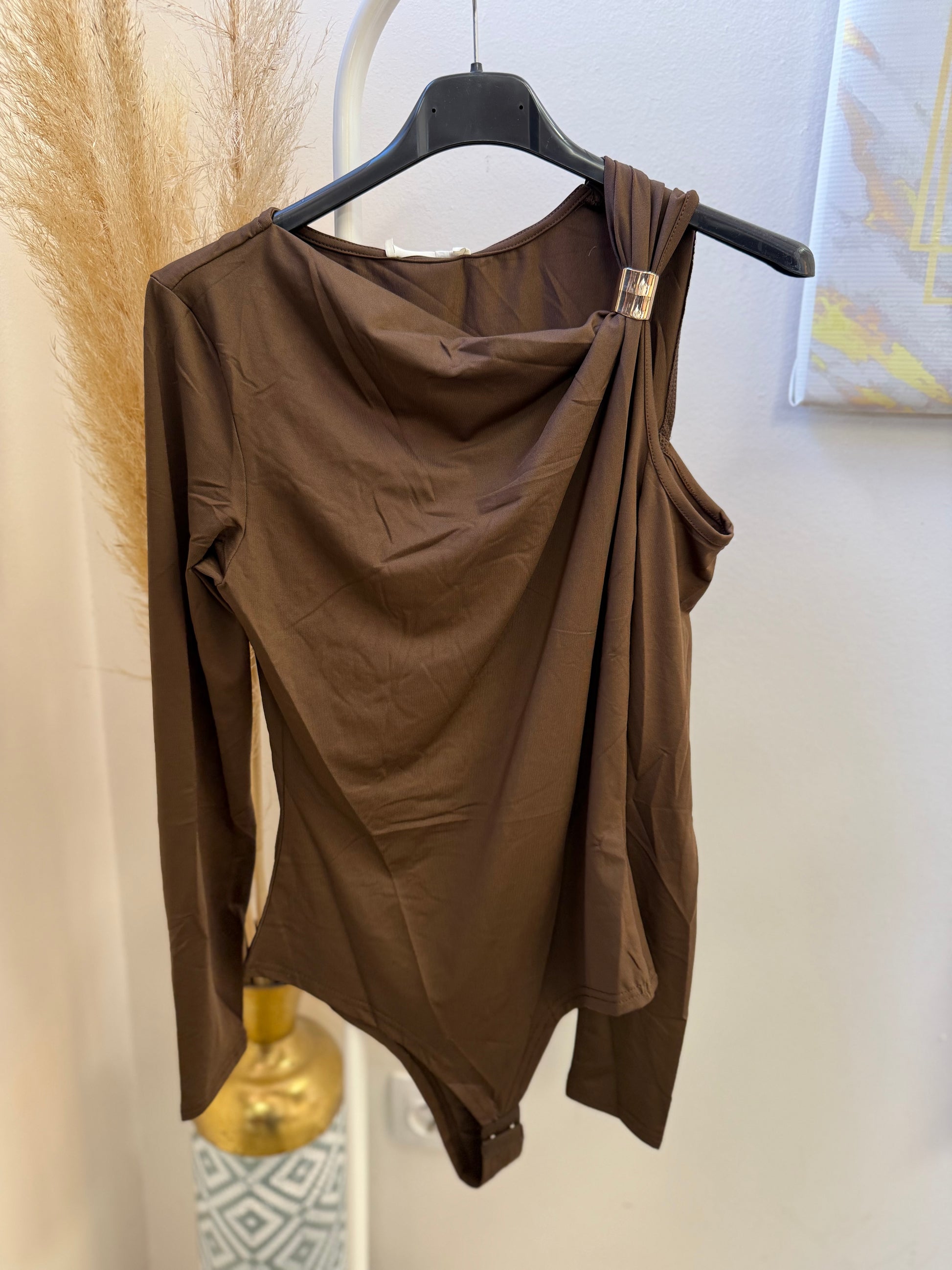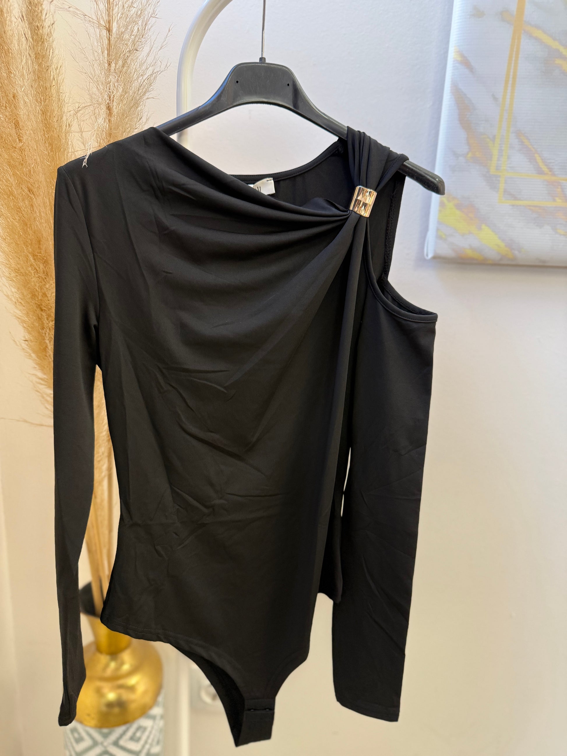 Λεπτομέρεια με τον έναν ώμο έξω και σουρα και μεταλλική λεπτομέρεια.
