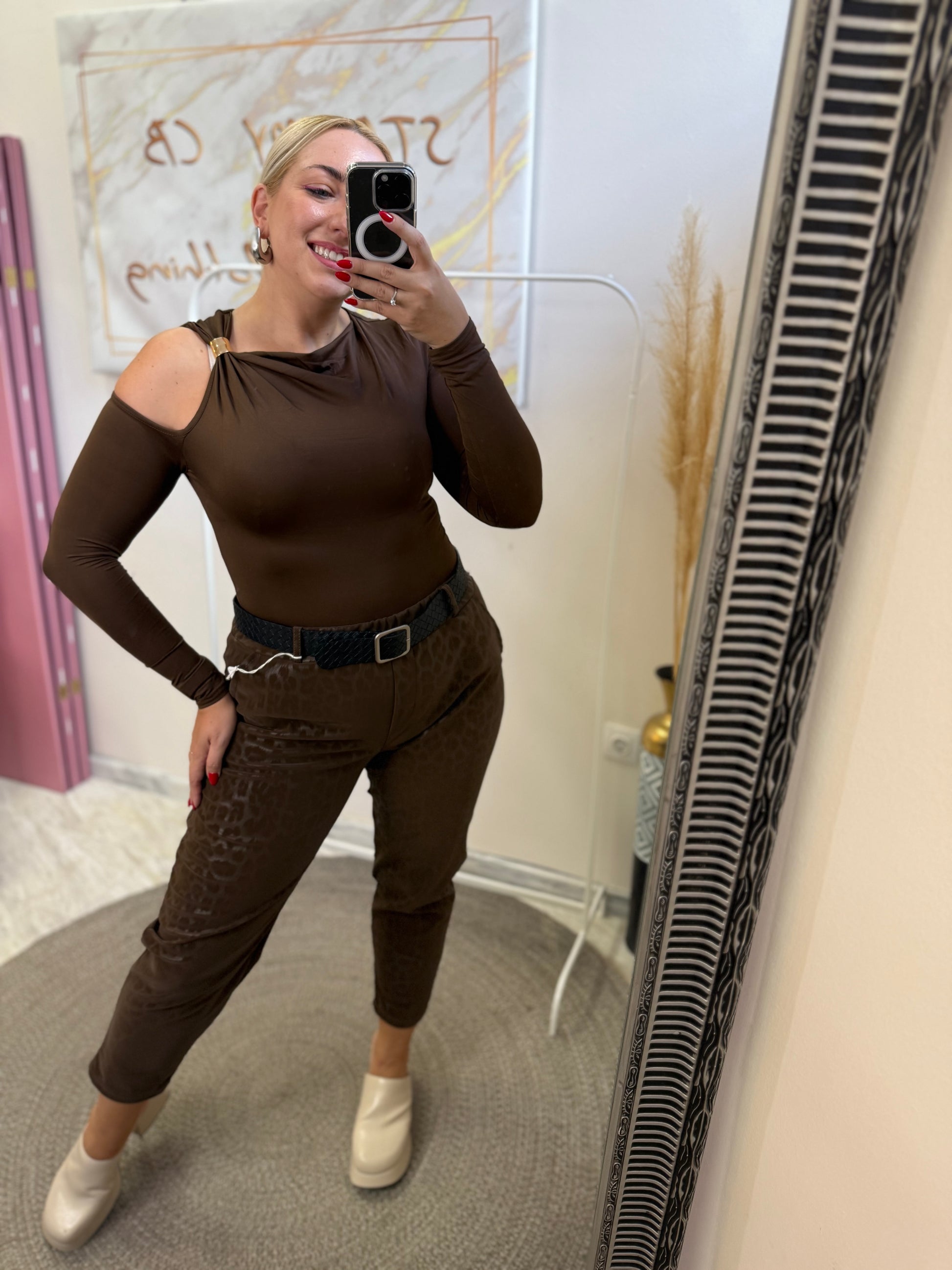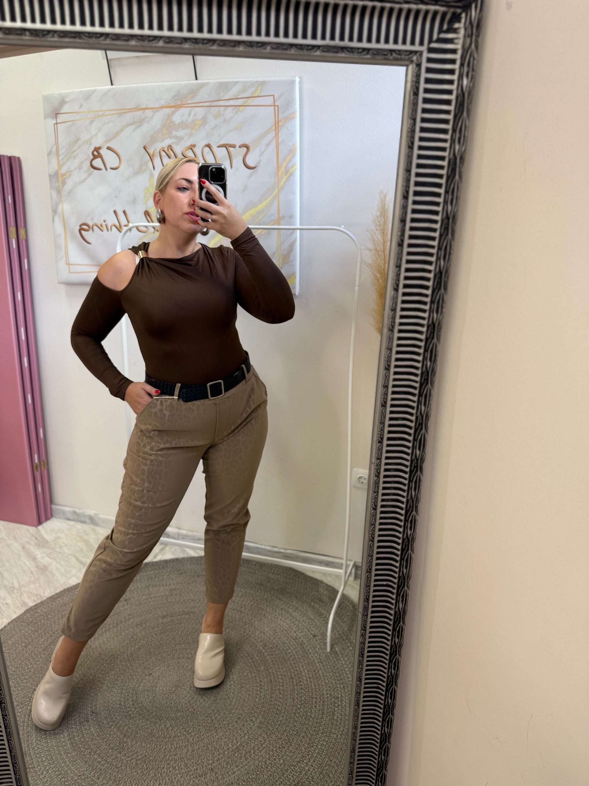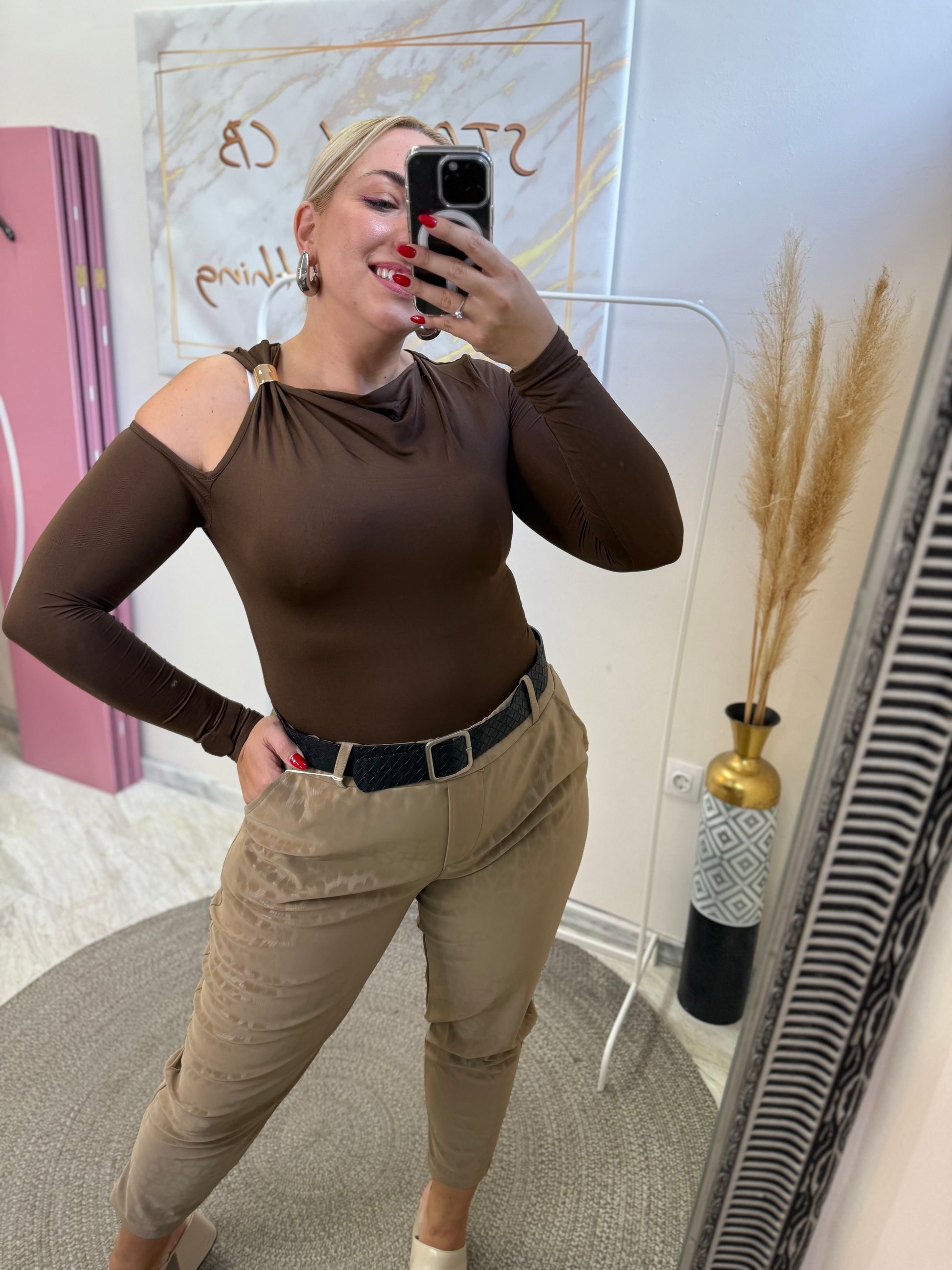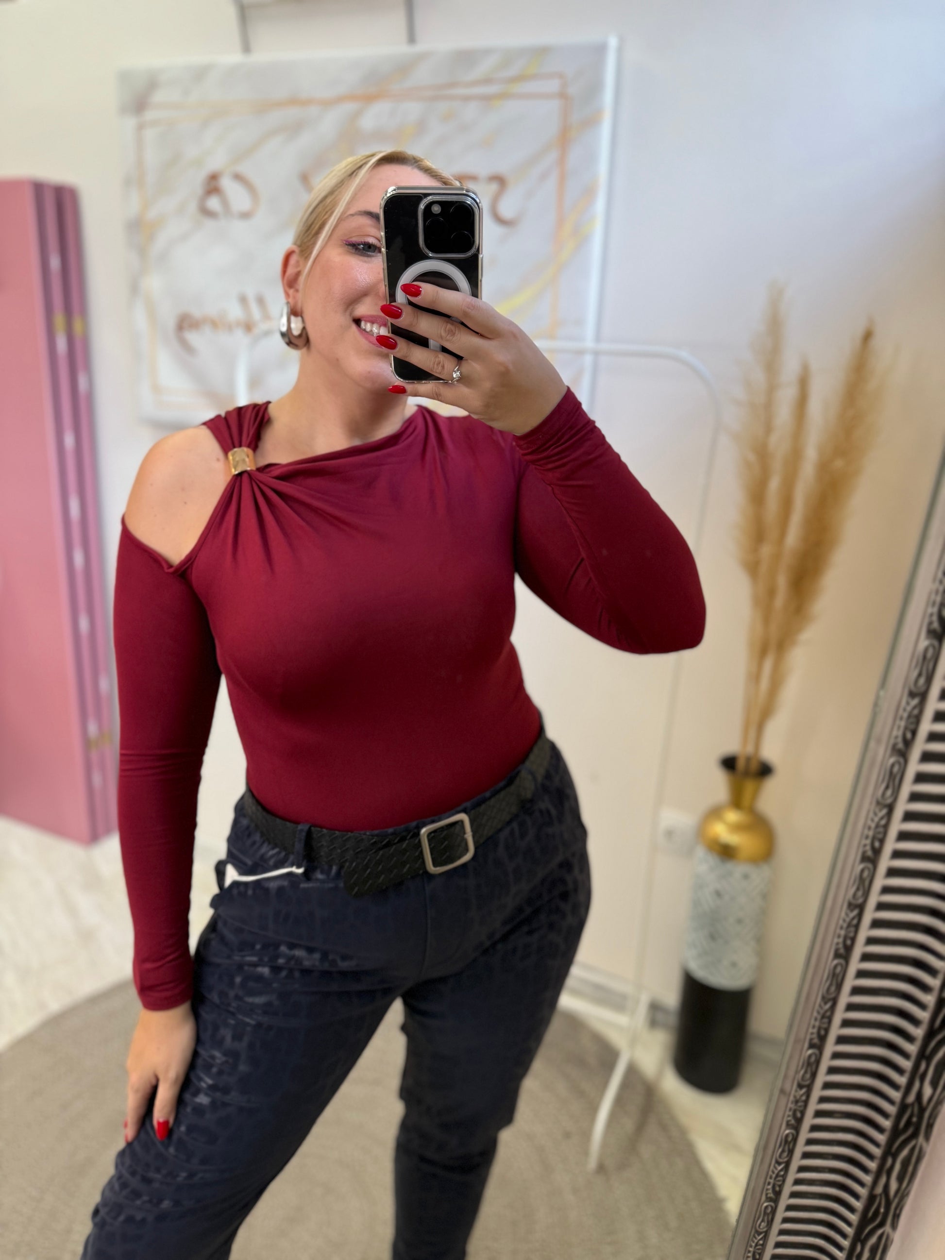 Λεπτομέρεια με τον έναν ώμο έξω και σουρα και μεταλλική λεπτομέρεια.