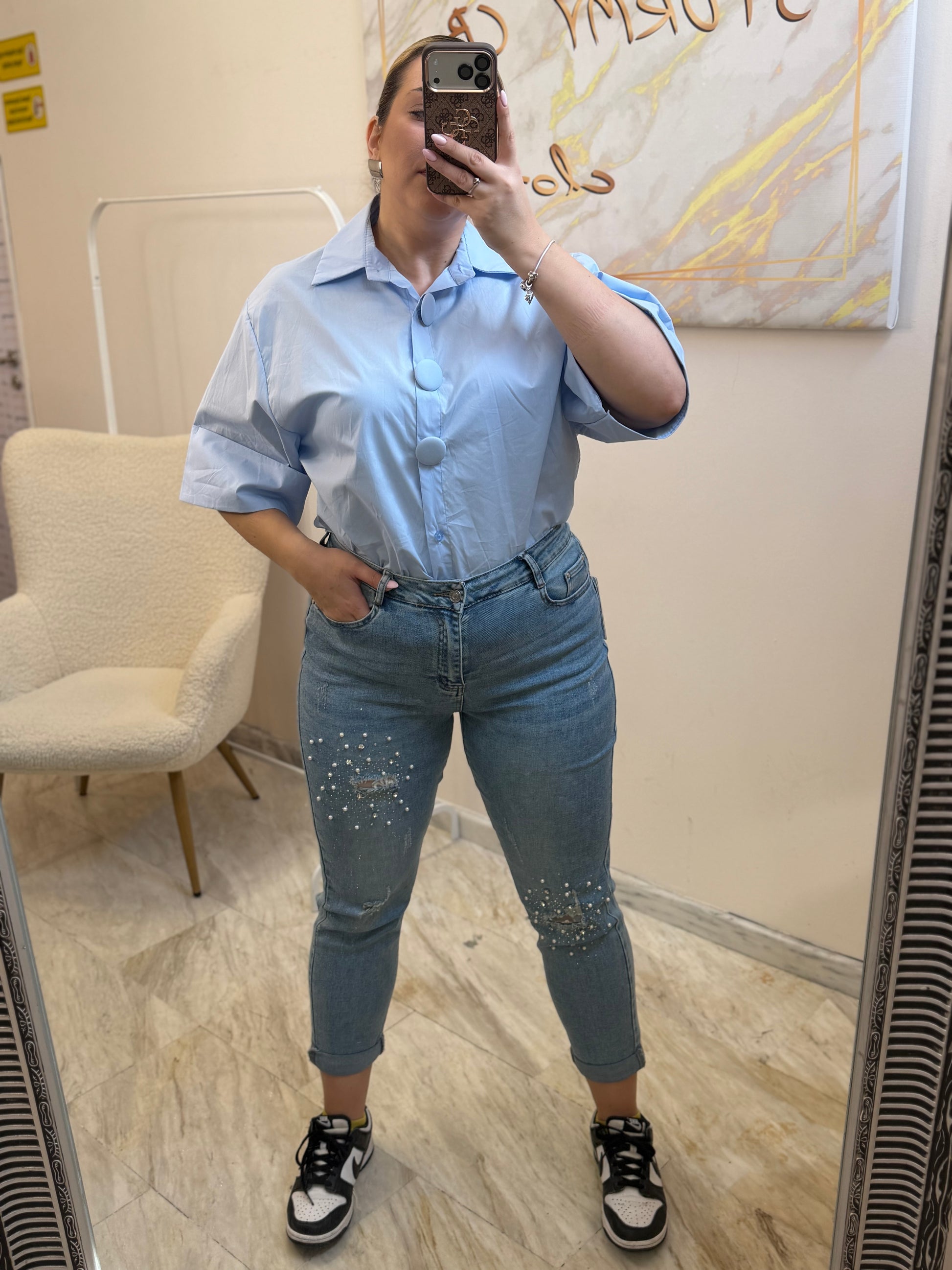 -Mon fit,ψηλομεσο στον αφαλό , με δύο σκισιματα επενδυμένα με δαντέλα και λεπτομέρειες στρας .