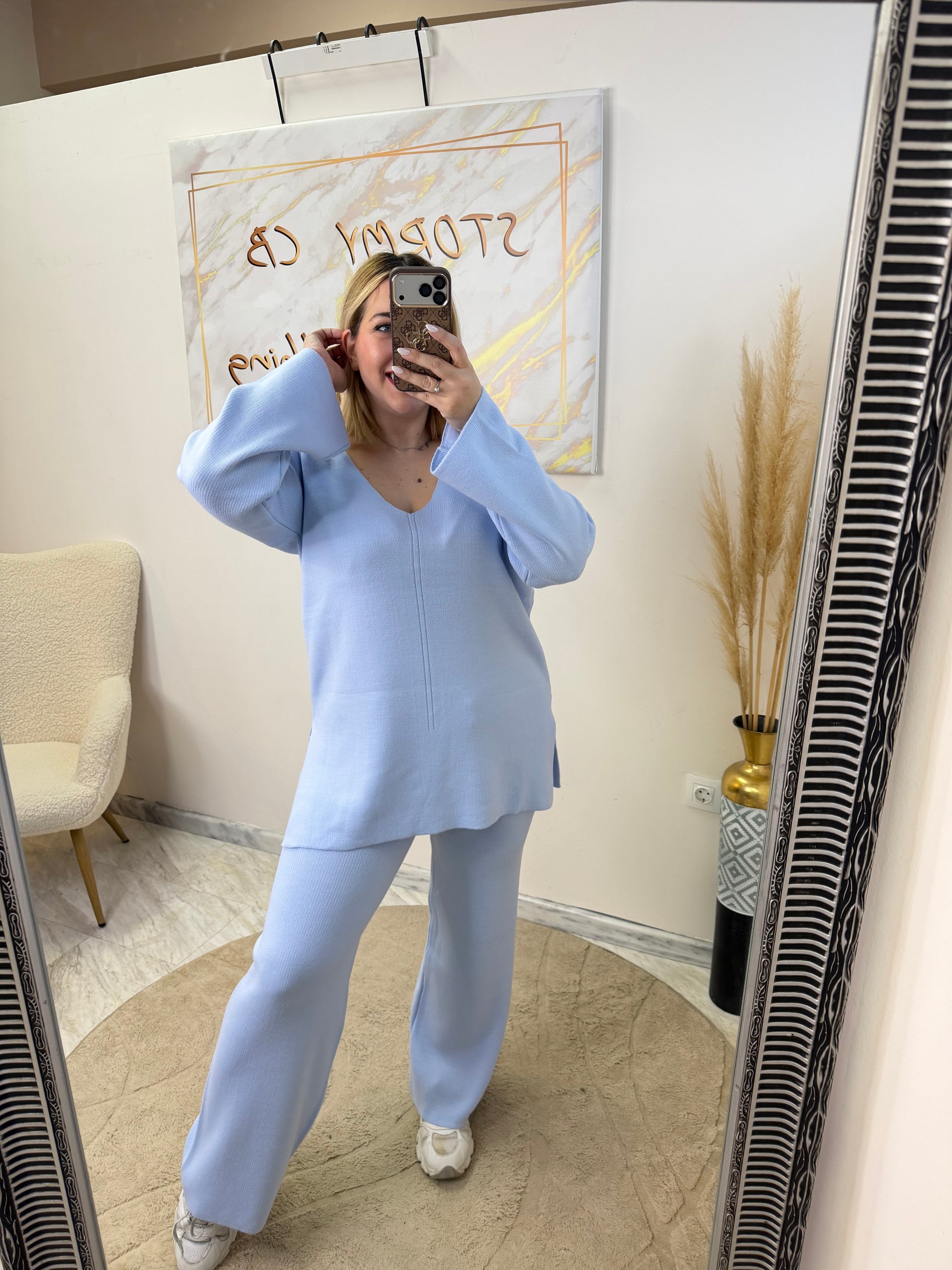 -Διαθέτει Ανετη μακριά μπλούζα με Βε λαιμοκοψη